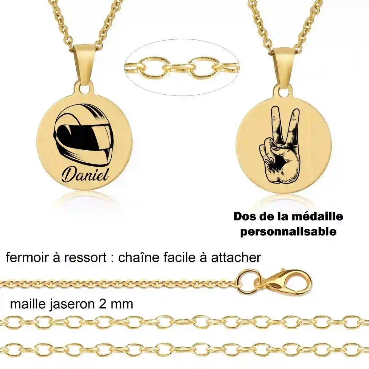En somme, notre collier casque de moto gravé allie style, robustesse et originalité. Il ravira tous les amoureux de deux-roues en quête d’un bijou unique qui leur ressemble. Ne passez pas à côté de cet accessoire incontournable et faites plaisir à un proche ou à vous-même en commandant dès maintenant !
