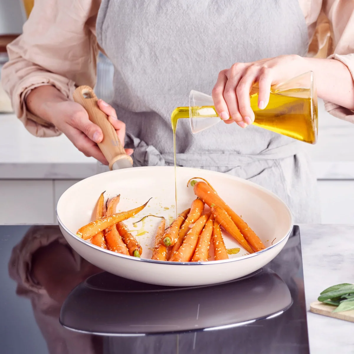 La poêle est dotée d’un revêtement antiadhésif en céramique Thermolon™ de haute qualité et sans PFAS. Pour une cuisine plus saine, avec moins de matière grasse, et une merveilleuse simplicité de nettoyage. Son bord renforcé rend cette poêle particulièrement résistante. Vous avez tendance à tapoter la spatule ou la cuillère sur le bord de la poêle ? Aucun souci ! De plus, cette poêle offre une somptueuse expérience culinaire sur tout type de cuisinière grâce à son fond à induction spécial.