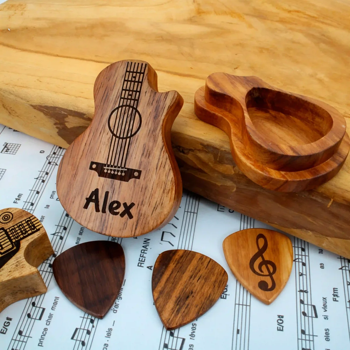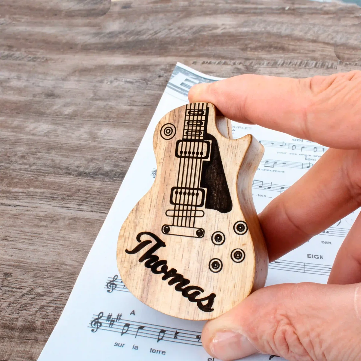 Chaque médiator personnalisé est présenté dans une magnifique boîte en forme de guitare. Fabriquée également en bois naturel, cette boîte est un hommage aux instruments classiques et apporte une touche rustique. Avec ses dimensions compactes, elle est idéale pour ranger et protéger les médiators, tout en décorant fièrement un coin de bureau ou une étagère.