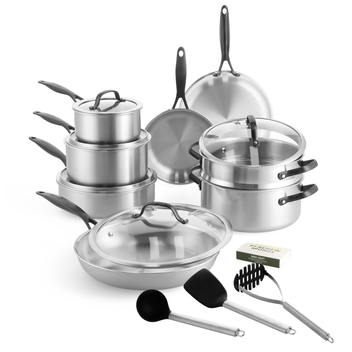 L’acier inoxydable 3 couches de qualité supérieure (corps en acier inoxydable recyclé à 55 %) garantit une chaleur uniforme, un contrôle précis, un brunissage, une cuisson, un rôtissage et un déglaçage parfaits, et bien plus encore.
