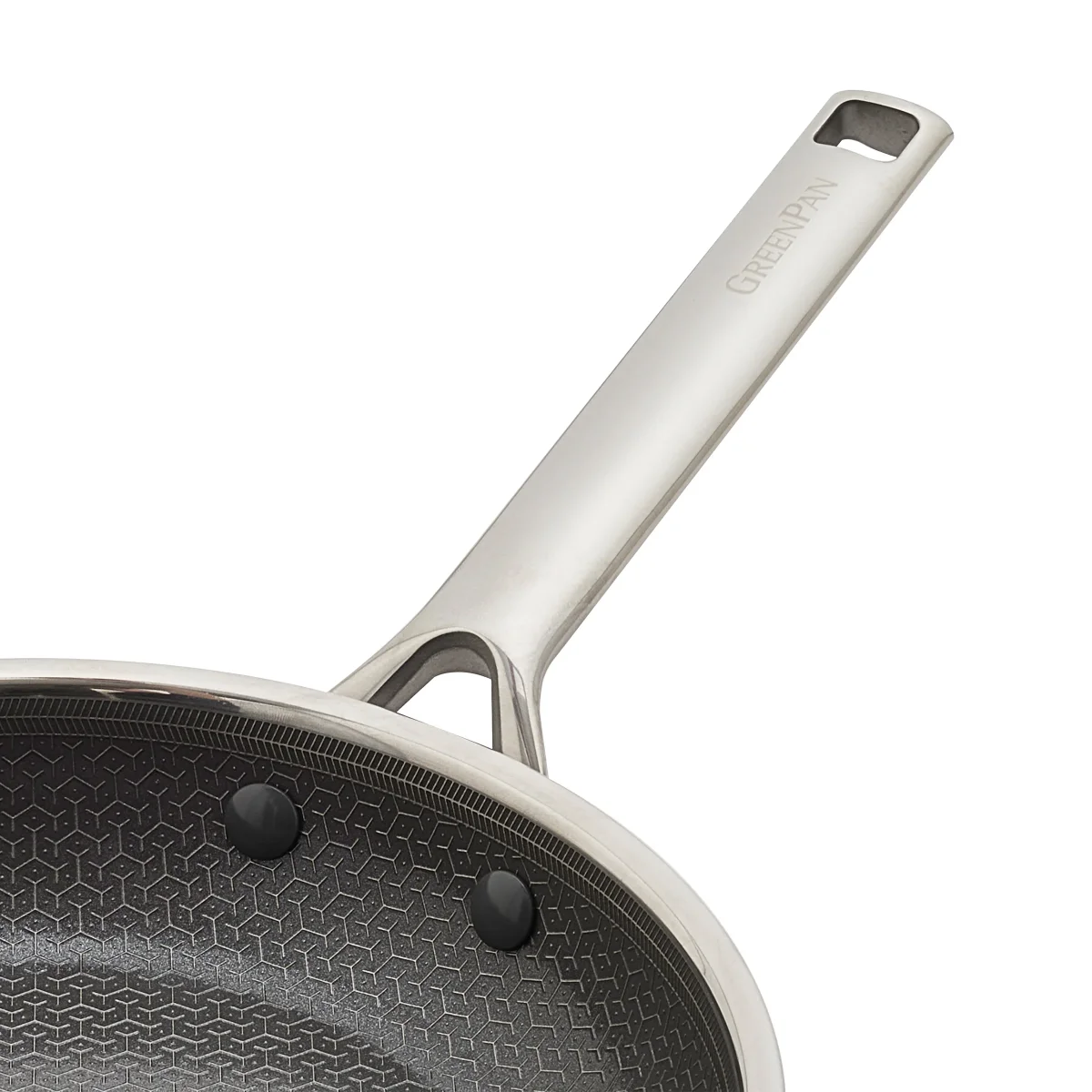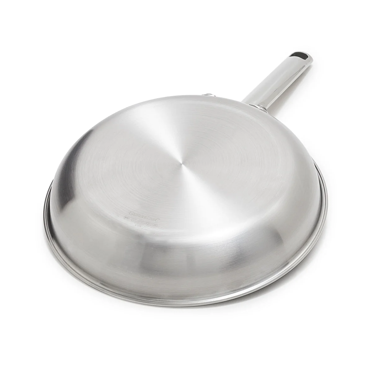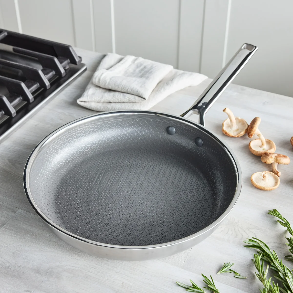Une grande poêle antiadhésive de 28 cm qui vous permet de saisir vos aliments sans effort. Alliez la résistance de l’acier inoxydable à triple épaisseur au confort de l’antiadhésif et faites cuire de la viande, du poisson ou des légumes jusqu’à ce qu’ils soient délicieusement croustillants, sans qu’ils n’attachent.