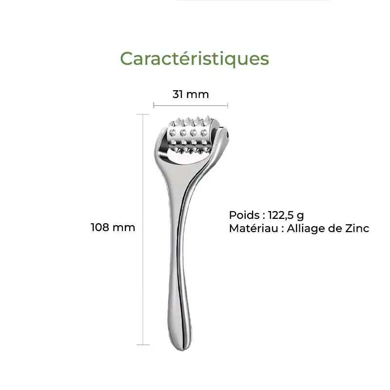 - Action en Profondeur : Le Ridoki est composé d’un manche et d’un rouleau muni de picots en zinc. Il permet une action en profondeur grâce à l’acupression, stimulant les points méridiens du visage pour favoriser une meilleure circulation du sang et de la lymphe.